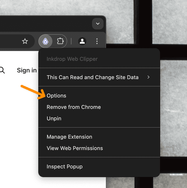 The web clipper needs to know how to access your local database server configured in your config.json. Open the extension options by right-clicking the extension toolbar icon and selecting "Options":