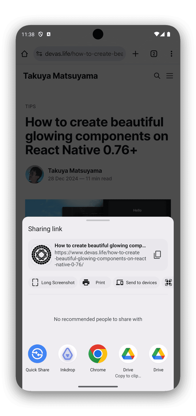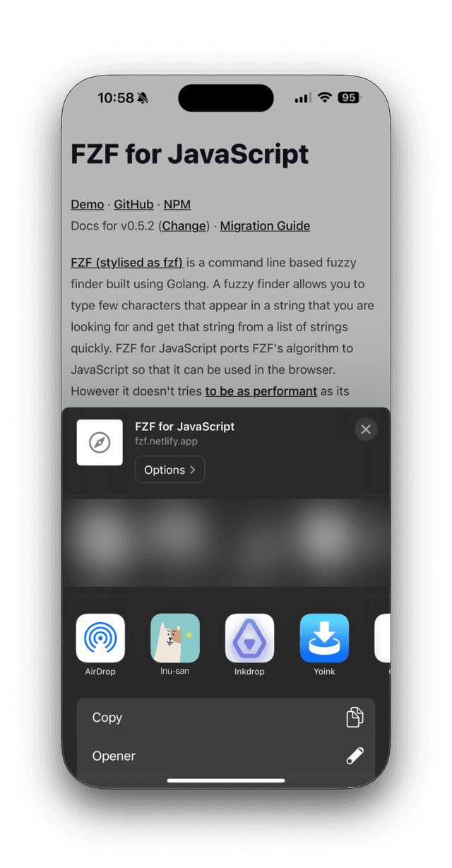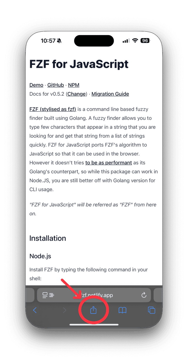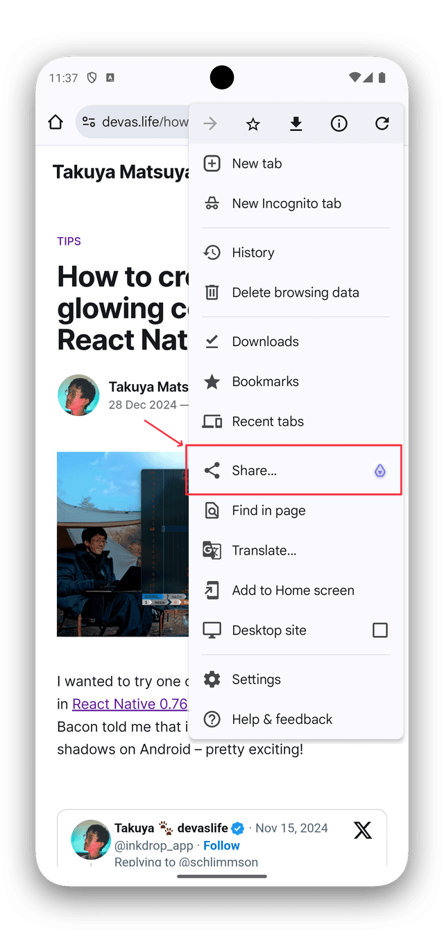 First, open a web page in your mobile browser and tap the share button. Then, select the "Inkdrop" icon from the share sheet.
