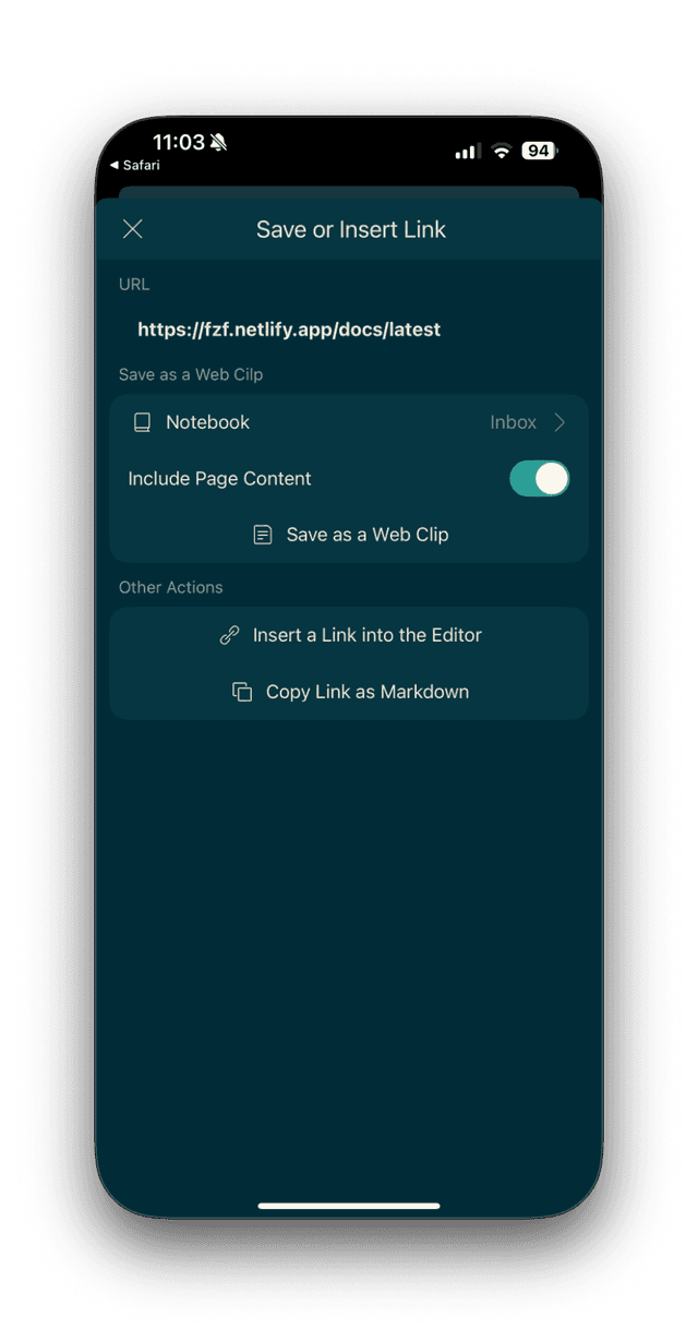 Inkdrop allows you to save links or clip web pages on mobile using the system share functionality on iOS and Android.