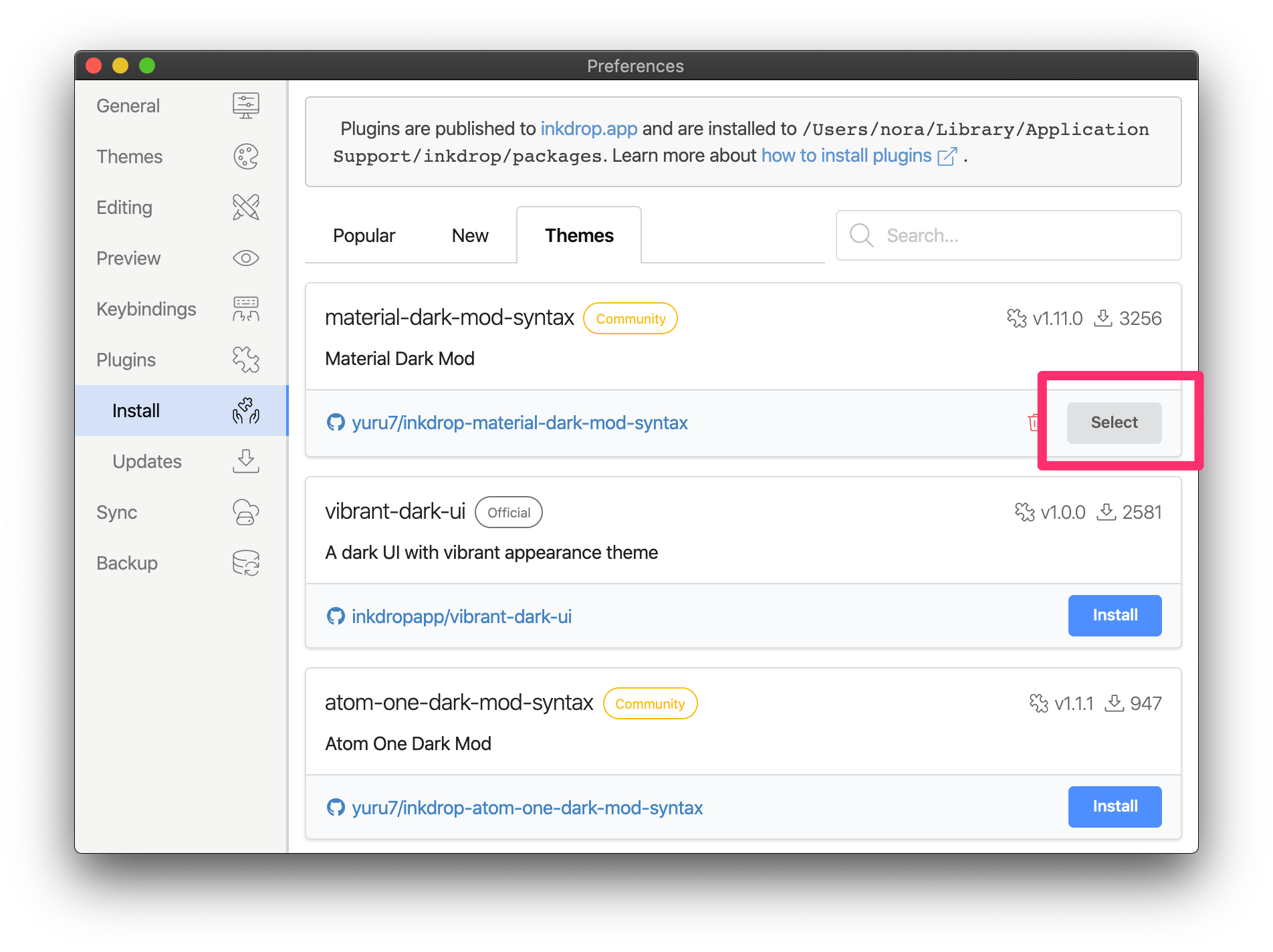 Once a plugin is installed in Inkdrop, it will show up in the Preferences window under the "Plugins" tab, along with all the pre-installed plugins that come with Inkdrop.