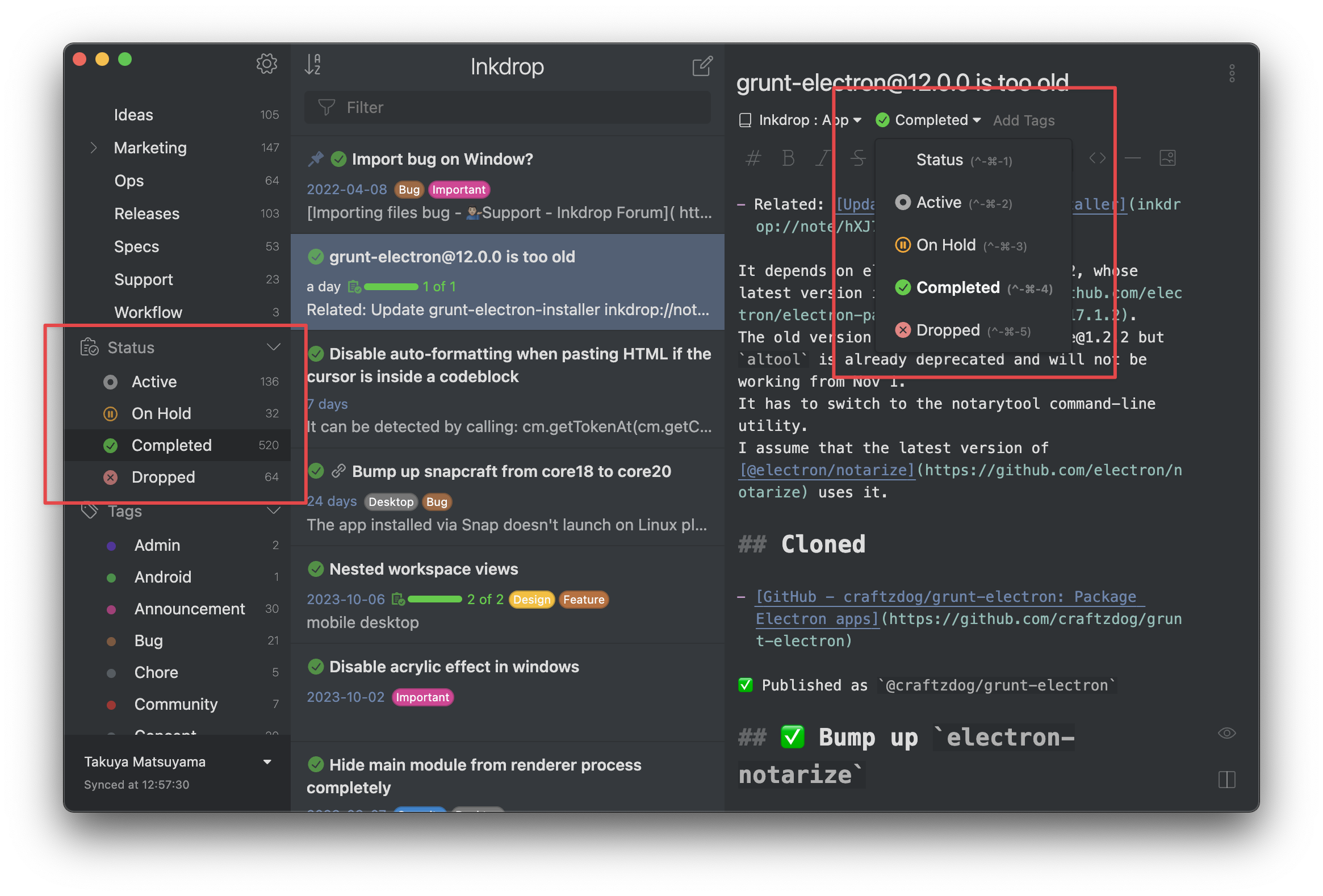 Inkdrop can have several statuses for your notes, including 'Active', 'On Hold', 'Completed', and 'Dropped'. And the notes with 'Completed' and 'Dropped' statuses are hidden in the note list by default when you view them via a notebook so you can focus on the active issues. You can view them by clicking the Completed and Dropped tabs on the sidebar.