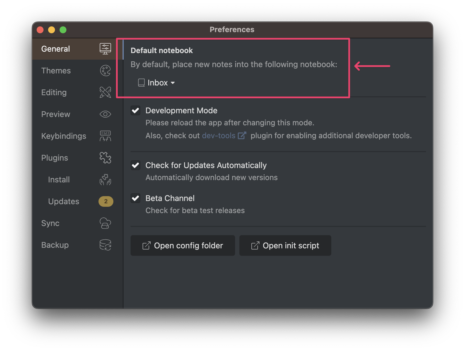 When creating a new note in the All Notes section, it will be created in the default notebook. You may want to change it after creating notebooks. It can be changed from Inkdrop > Preferences > General > Default notebook.