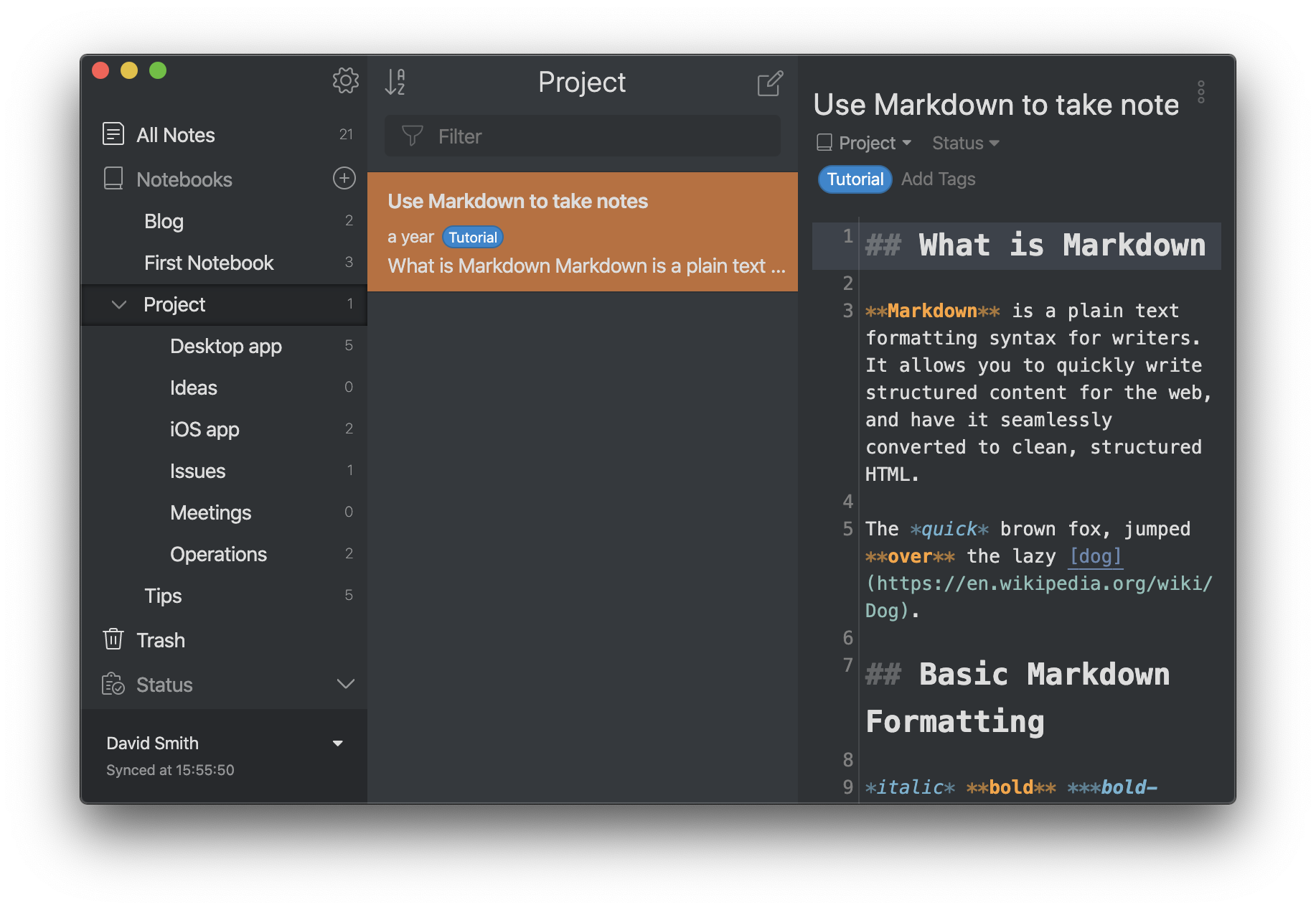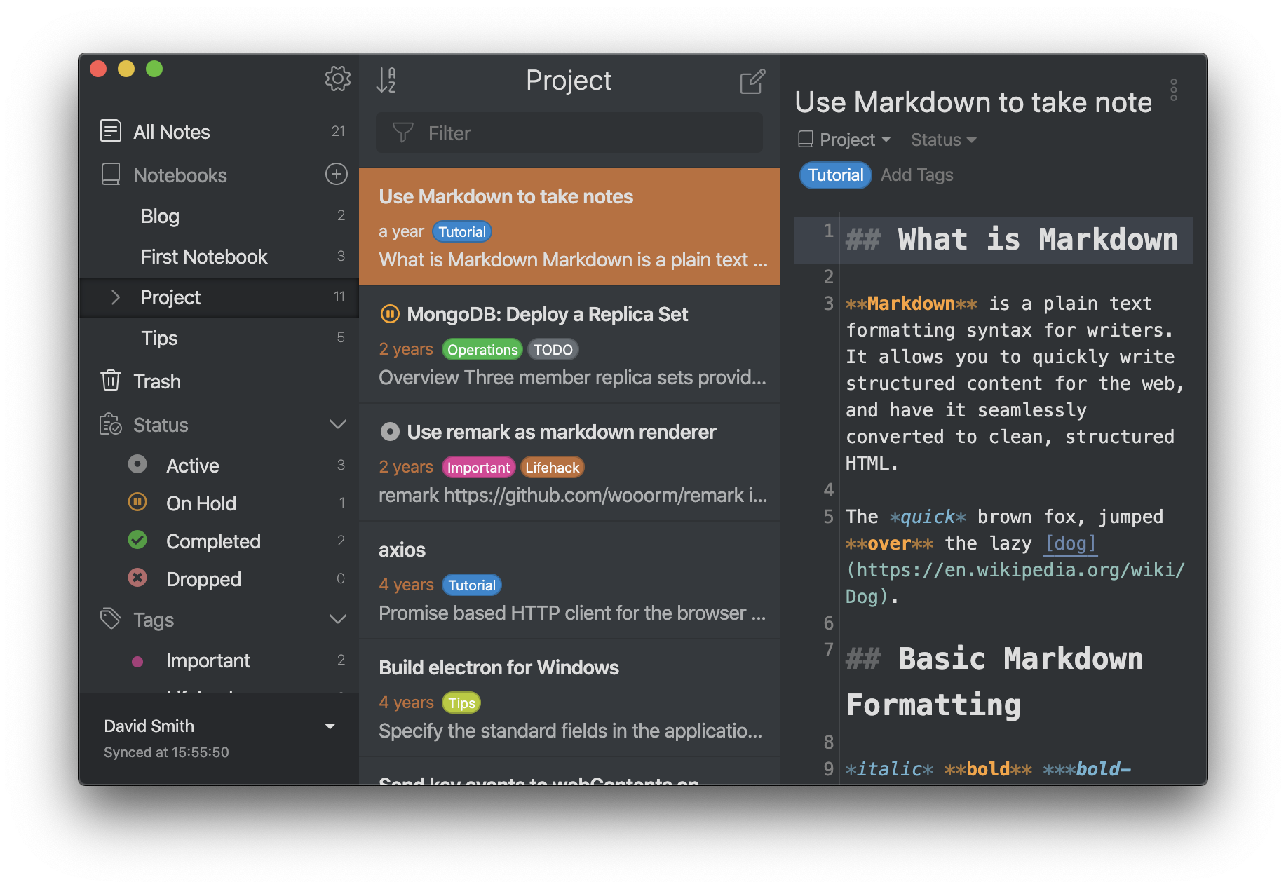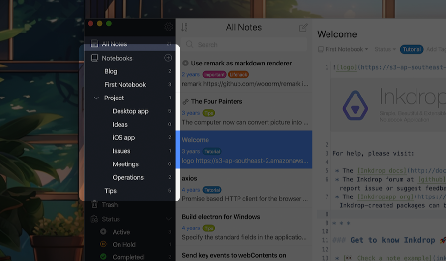 One of the ways to think about notebooks is like separate projects. Every notebook covers a specific topic and can be divided into sub-notebooks. Every (sub)notebook has a list of notes, and every note can have tags and statuses. When the number of notebooks or their content grows, notebooks management can become a nightmare. Inkdrop lets you gracefully organize the notebooks, declutter your workspace, and display the information that belongs to a specific notebook.