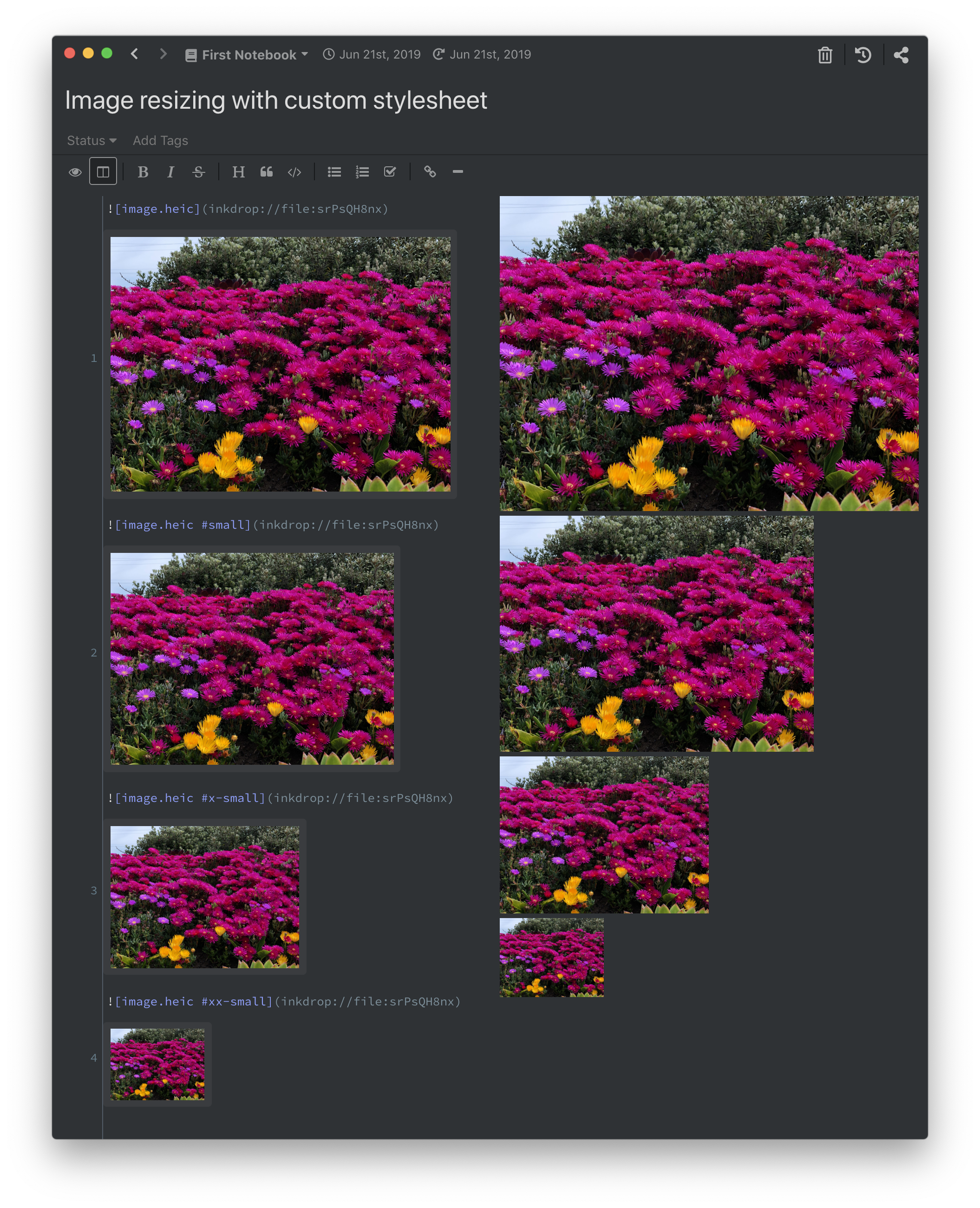 With these rules defined, your images with alt attribute ending with #small will be rendered in small size. You can insert images in Markdown as following: