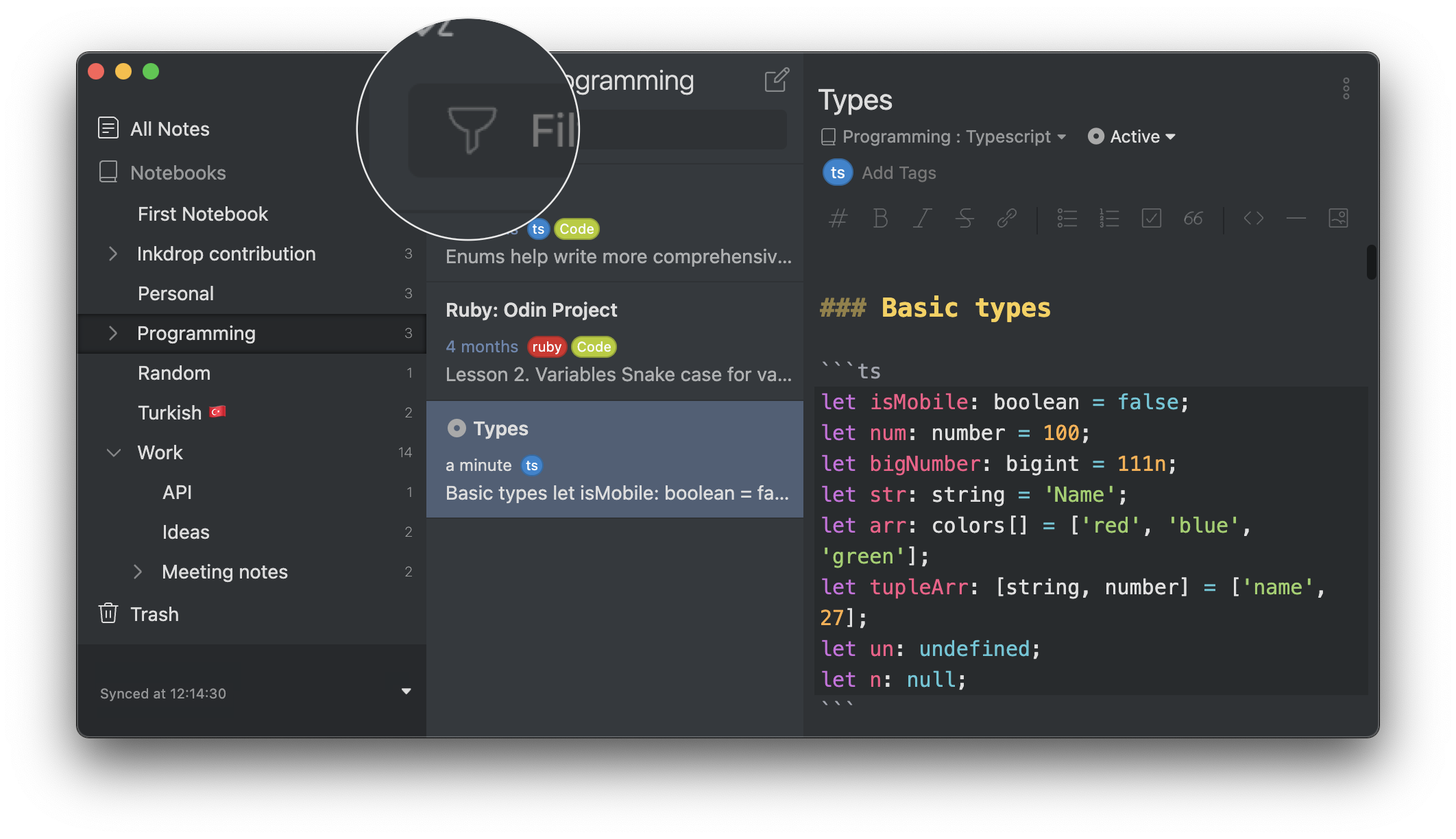 - Filtering: Inkdrop looks for the notes only within a specific notebook. You can think of it as a local search.