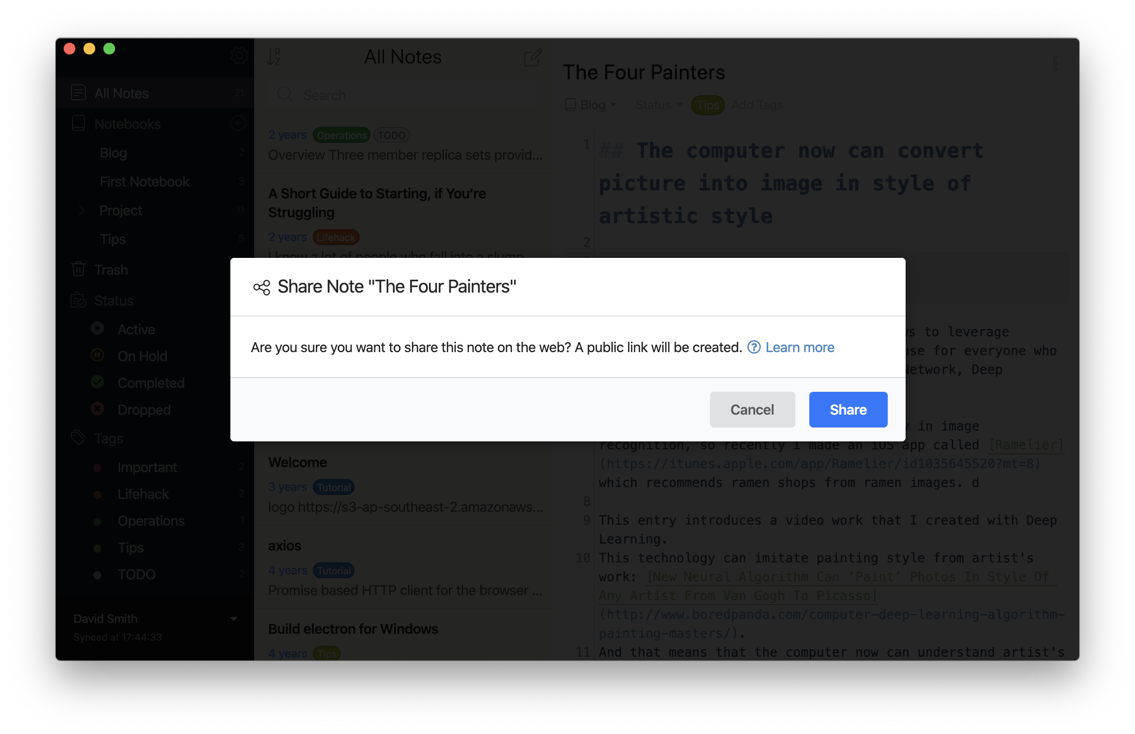You will see a dialog which confirms you share the note on the web. Press “Share” button to proceed.