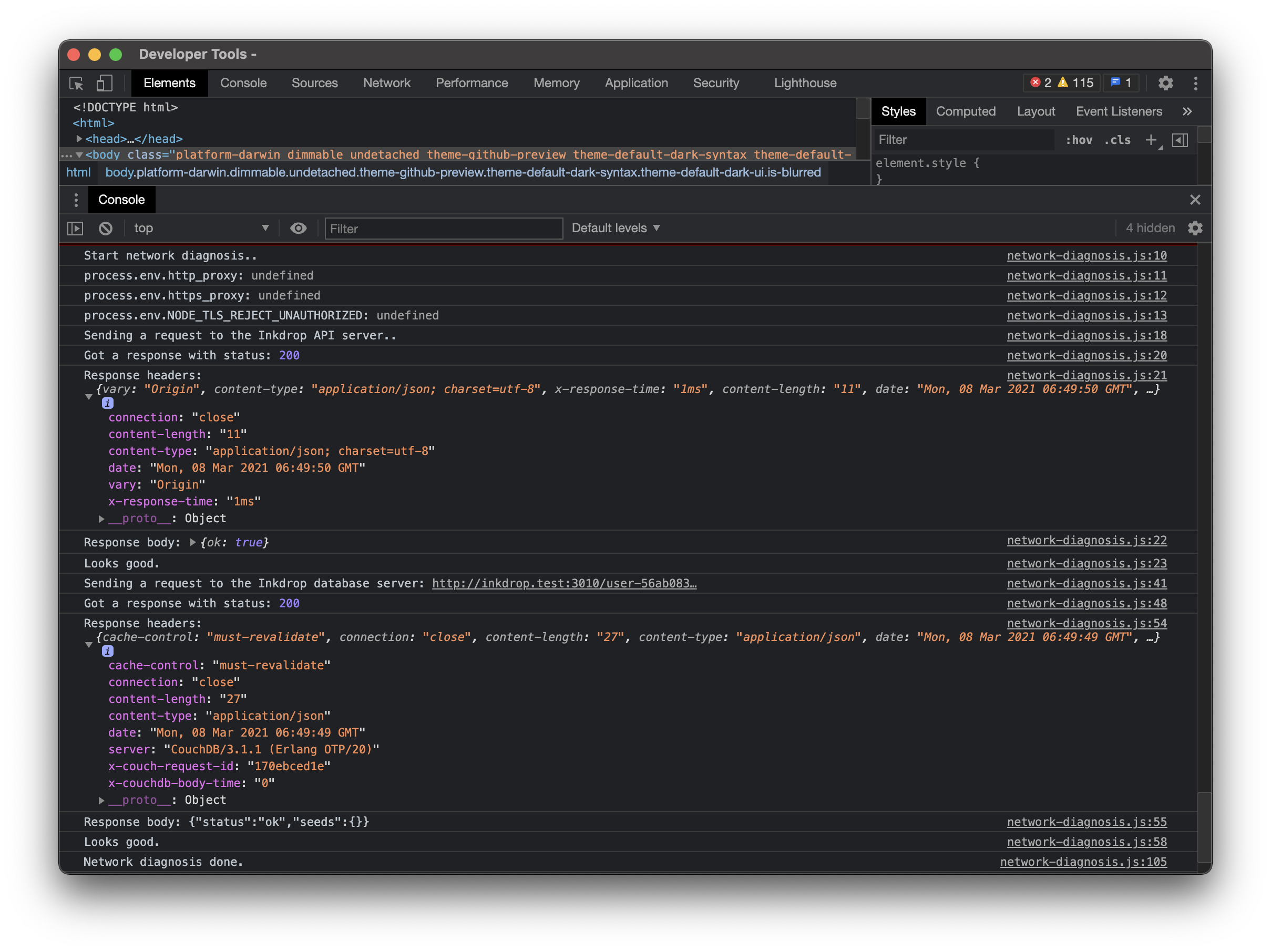 It launches Developer Tools and reports the diagnosis result in the console. You should get something like this: