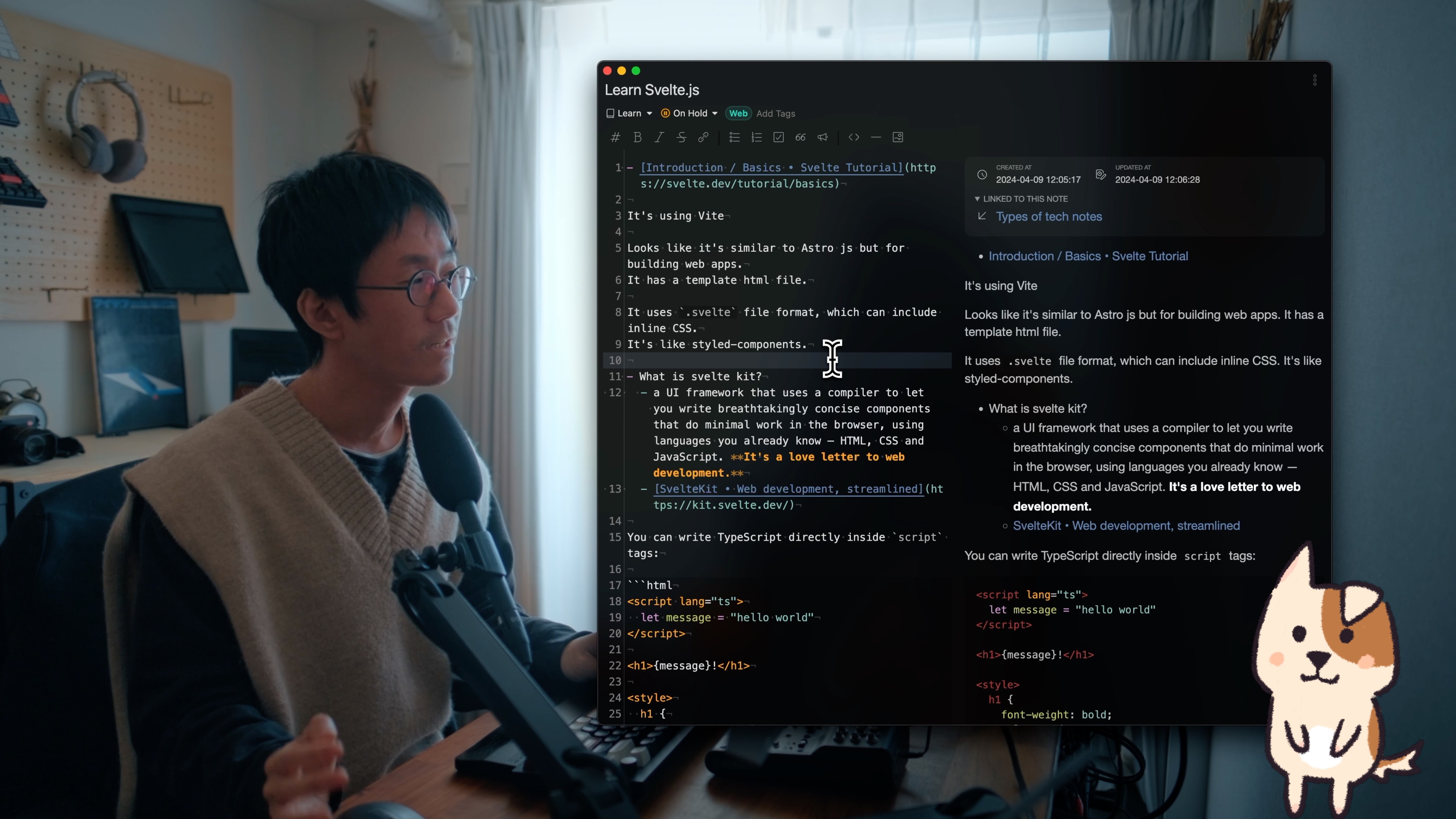 Here is an example note, which I took notes while learning Svelte.js. As you can see, whenever I encounter something I don't understand, I simply document my confusion in this way. Unlike school study notes, it doesn't help you learn by just copying & pasting the official documentation into your notes. Instead, you should write not only what you understand, but also what you don't understand.