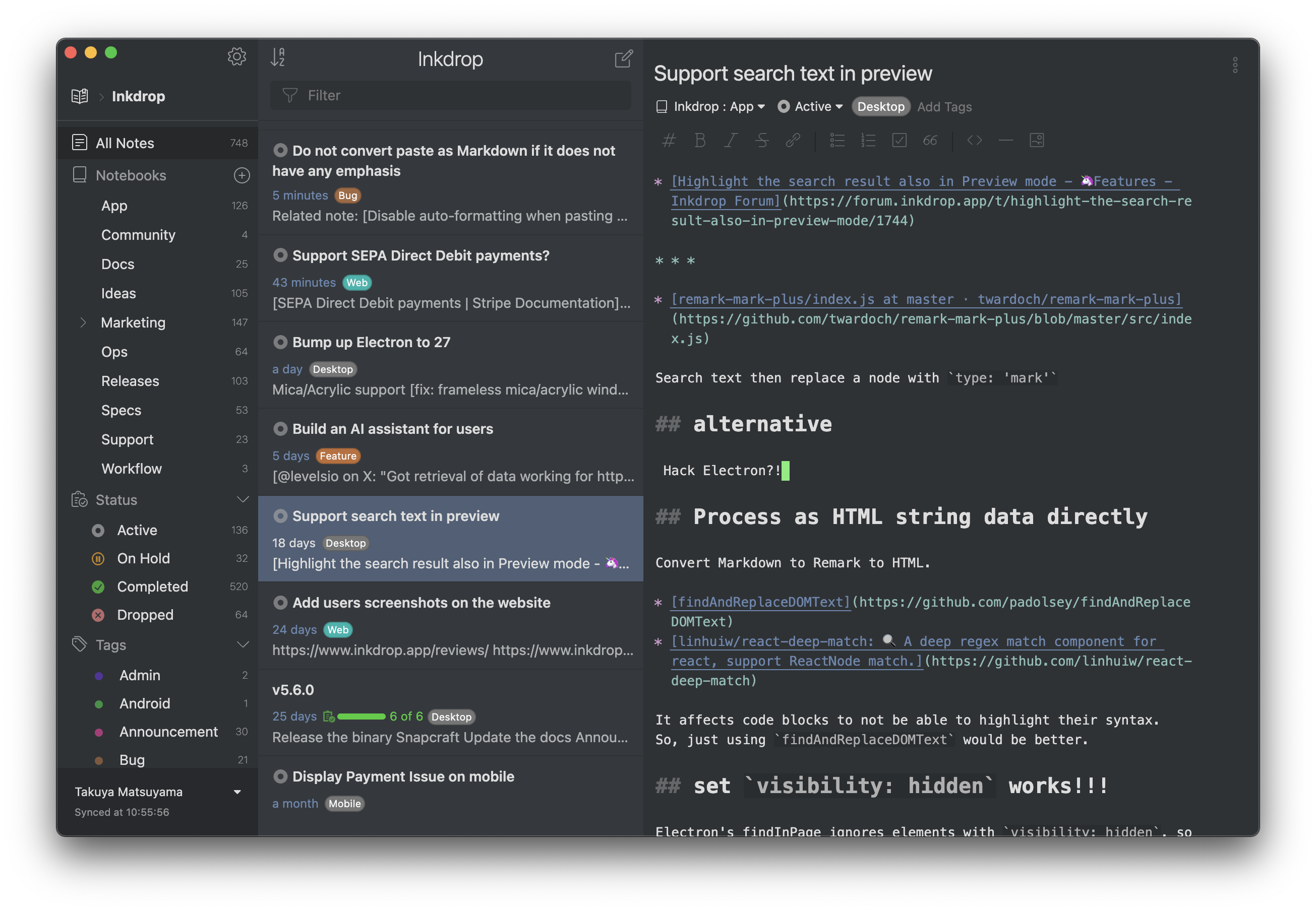 Note-taking apps basically allow you to write anything, but without a focused approach, it's easy to feel overwhelmed and confused. Inkdrop is specifically designed to improve your engineering process. It's ideal for managing technical tasks and project-related notes rather than daily-life chores, glossaries, or travel plans. For those, you might find other apps more suitable.