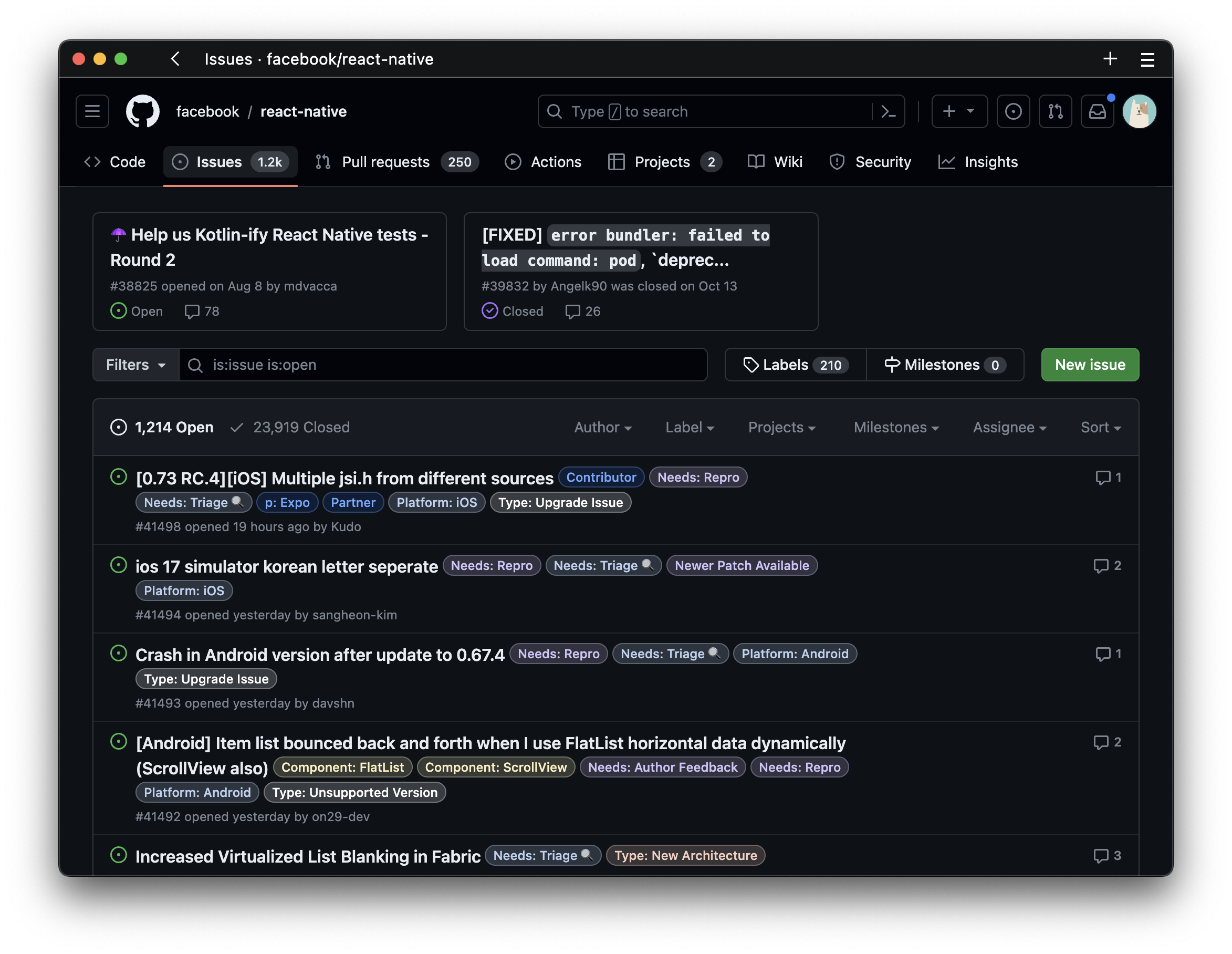 When taking tech notes on Inkdrop, it is highly recommended to follow the simple rule: One note per issue. An issue can be a problem, task, or any matter that you encounter in your projects. Software developers commonly manage their tasks using issue trackers like GitHub Issues. For instance, consider the issues in the React Native repository on GitHub: